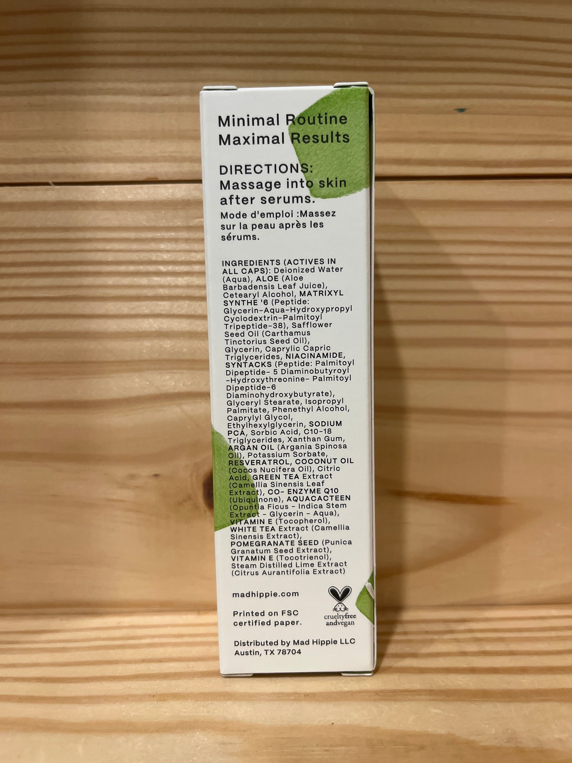 Full List of Ingredients: Water, Aloe (Aloe Barbadensis Leaf Juice), Cetearyl Alcohol, Matrixyl Synthe '6 (Peptide: Glycerin - Aqua - Hydroxypropyl Cyclodextrin - Palmitoyl Tripeptide-38), Safflower Seed Oil (Carthamus Tinctorius Seed Oil), Glycerin, Caprylic Capric Triglycerides, Niacinamide, Syntacks (Peptide: Palmitoyl Dipeptide-5 Diaminobutyroyl - Hydroxythreonine - Palmitoyl Dipeptide-6 Diaminohydroxybutyrate), Glyceryl Stearate, Isopropyl Palmitate, Phenethyl Alcohol, Caprylyl Glycol, Ethylhexyl Glycerin, Sodium PCA, Sorbic Acid, C10-18 Triglycerides, Xanthan Gum, Argan Oil (Argania Spinosa Oil), Potassium Sorbate, Resveratrol, Coconut Oil (Cocos Nucifera Oil), Citric acid, Green Tea Extract (Camellia sinensis Leaf Extract), Coenzyme Q10 (Ubiquinone), Acai Extract (Euterpe Oleracea Fruit Extract), Vitamin E (Tocopherol), White Tea Extract (Camellia Sinensis Extract), Pomegranate Seed (Punica Granatum Seed Extract), Vitamin E (Tocotrienol), Steam Distilled Lime Extract (Citrus Aurantifolia Extract)