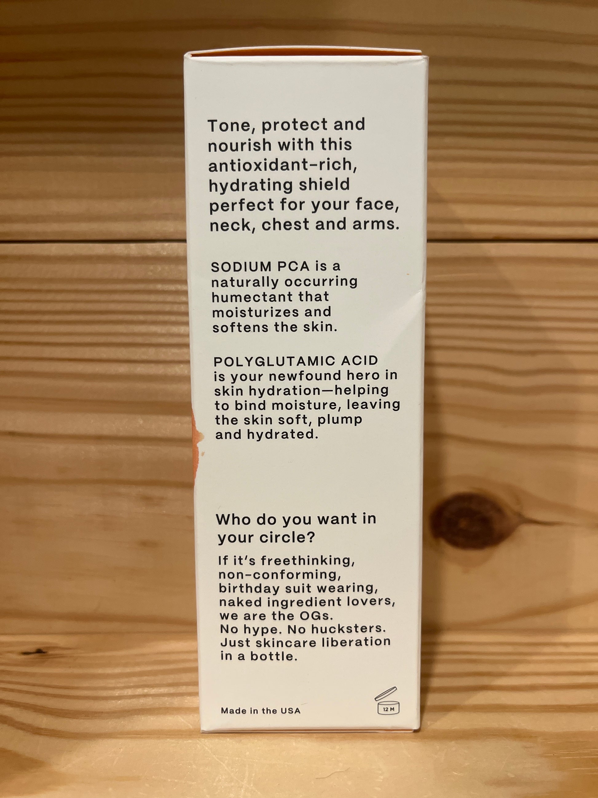 Full List of Ingredients: Water (Aqua), Vitamin C (Sodium Ascorbyl Phosphate), Glycerin, Sodium PCA, White Tea (Camellia Sinensis Extract), Hyaluronic Acid (Sodium Hyaluronate), Ferulic Acid, Green Tea (Camellia Sinensis Leaf Extract), Hesperidin, Grape Seed Extract (Vitis Vinifera), Ginkgo Biloba Extract, Pomegranate Seed (Punica Granatum Seed Extract), Resveratrol, Phenethyl Alcohol, Steam Distilled Lime (Citrus Aurantifolia Extract), Sorbitan Oleate Decylglucoside Crosspolymer, Caprylyl Glycol, Beta-Glucan, N-Acetyl D Glucosamine, Ethylhexyl Glycerin, White Pine (Pinus Stobus Bark Extract), Glycine Soja (Soybean) Sterols, Japanese Pagoda Tree (Sophora Japonica Fruit Extract), Milk Thistle (Silybum Marianum Fruit Extract), Alpha Lipoic Acid